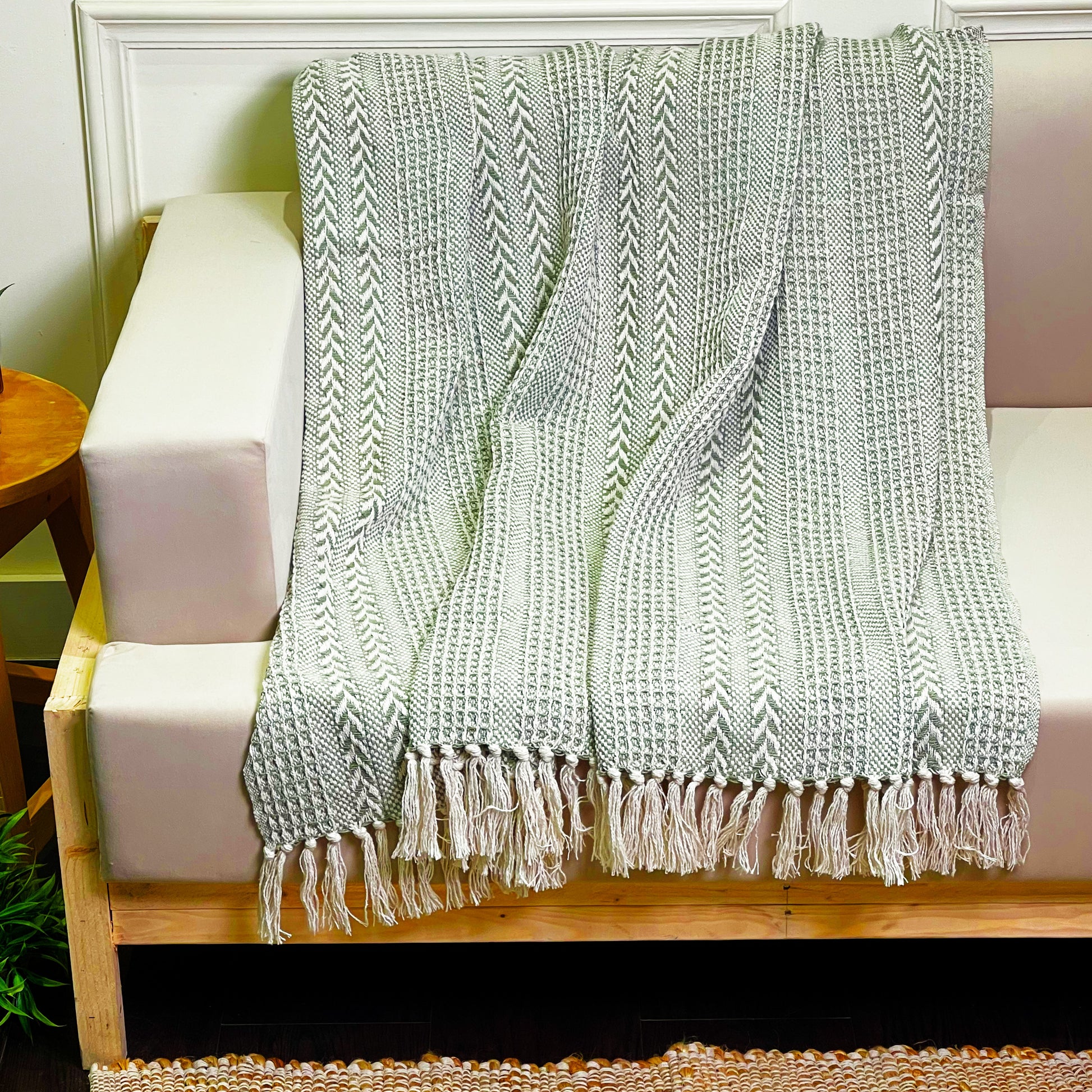 BRAIDED WAFFLE THROW, SAGE GREEN-IVORY, 50''x60''